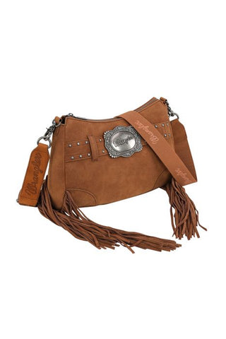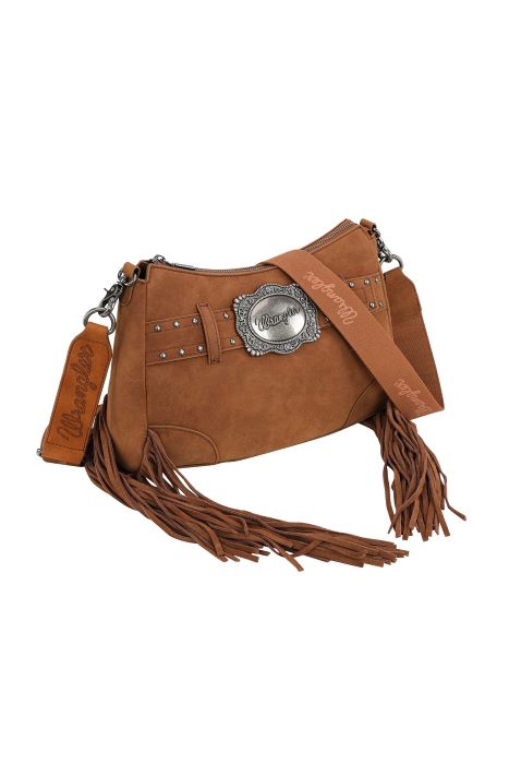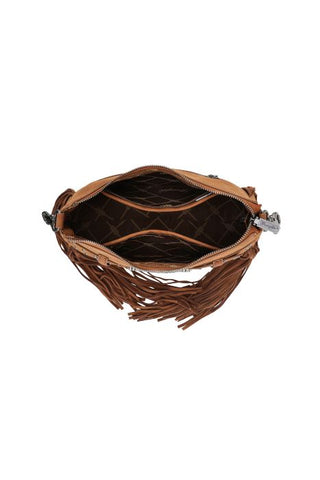 Crafted from PU leather with authentic suede fringing, it features a distinctive front buckle detail that catches the eye.