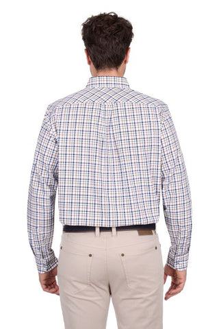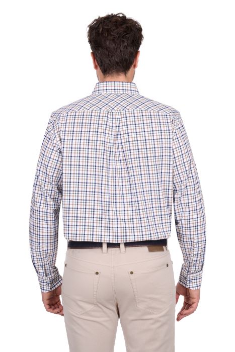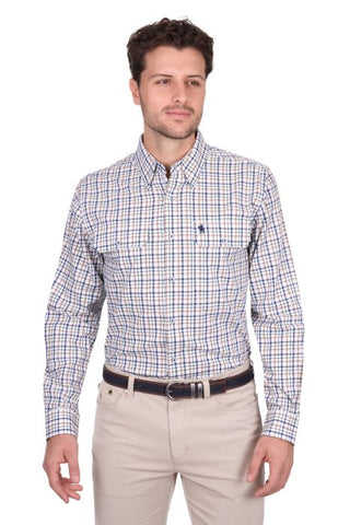 Yarn Dyed Check 2-Pocket Long Sleeve Shirt featuring a practical pen holder pocket and extended shirt tail for tucking. Designed with a back pleat for enhanced comfort and freedom of movement. Concealed collar peak buttons and removable collar stays provide a polished appearance, while horseman embroidery on the chest pocket adds distinctive character. Ideal for work or casual wear.