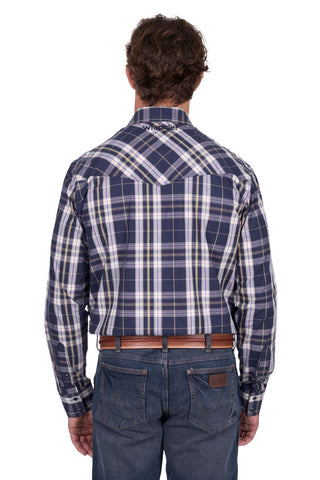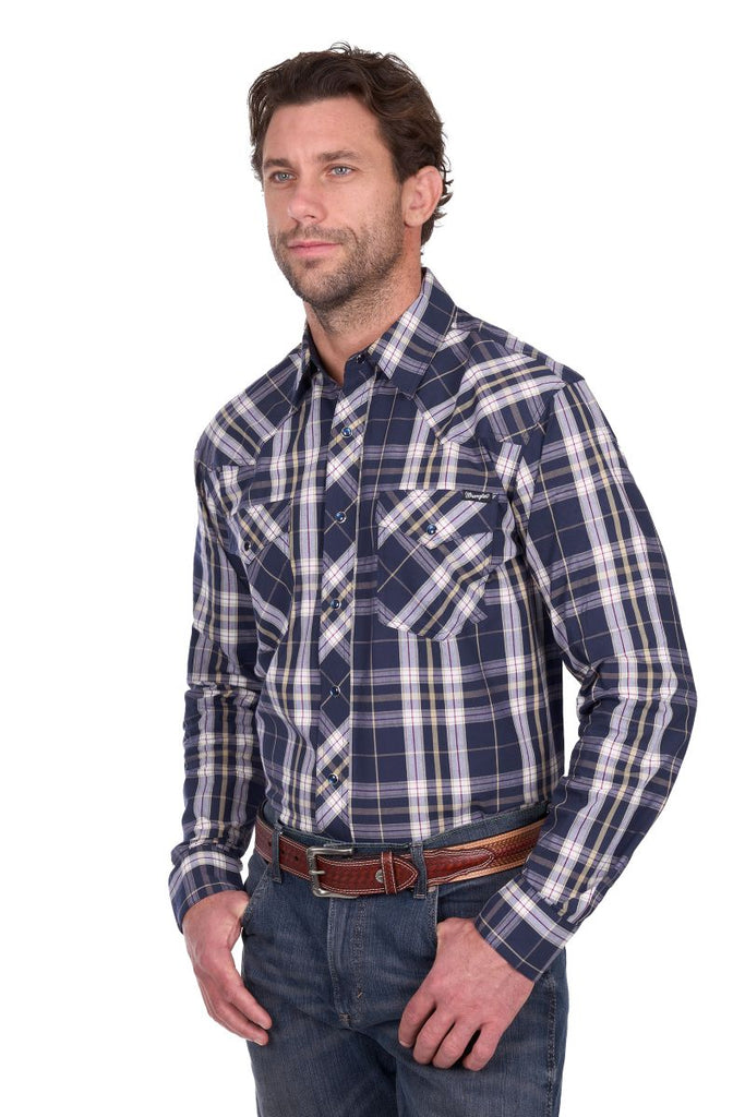 The Men’s Wayne Check Western Long Sleeve Shirt from Wrangler is a classic western-style shirt designed for everyday wear. It features a snap closure and traditional western chest pockets, one with a pen holder for practical convenience. Western front and back yokes deliver authentic styling, while contrast trim on the inside collar stand adds subtle detail. The sleeve includes embroidered logo branding for a premium finish. This shirt offers stretch for comfort and movement and pairs well with jeans or boots. Durable construction and quality materials make it suitable for work, casual wear and outdoor occasions.