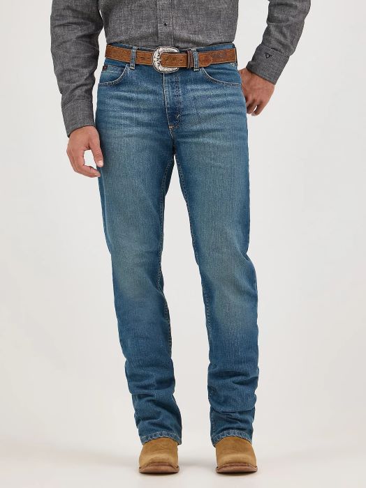 Experience authentic cowboy style with the Men's Cody Johnson 20X® Advanced Comfort 01 Competition Relaxed Jean. Designed with an 11 5/8" front rise and relaxed fit through the seat and thigh, these jeans deliver comfort without compromising on classic Western appeal. The straight leg opening accommodates boots perfectly, while iconic five-pocket styling and signature 'W' stitching keep the traditional look intact. Finished with the Wrangler® patch and COJO's emblem at the hip and button, these are the jeans that capture true cowboy spirit.